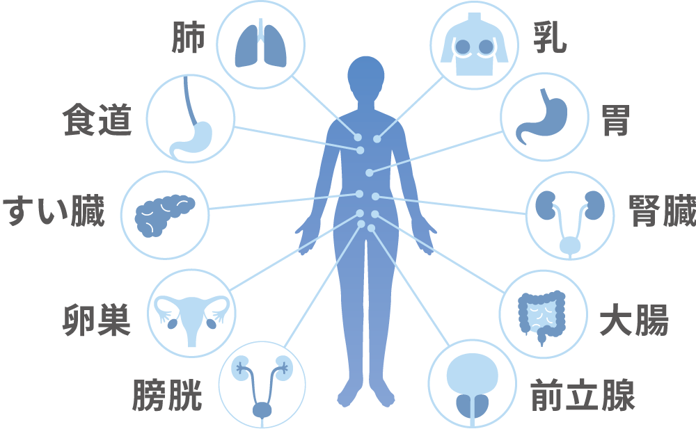 マイシグナルでは10種類のがん種 大腸がん 肺がん 胃がん 乳がん すい臓がん 食道がん 卵巣がん 腎臓がん 膀胱がん 前立腺がん の検査ができます。